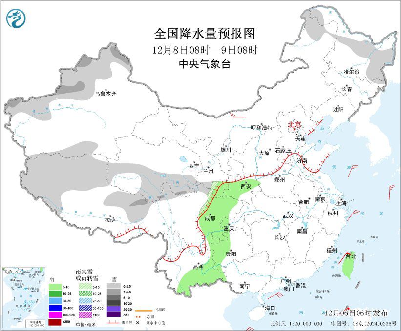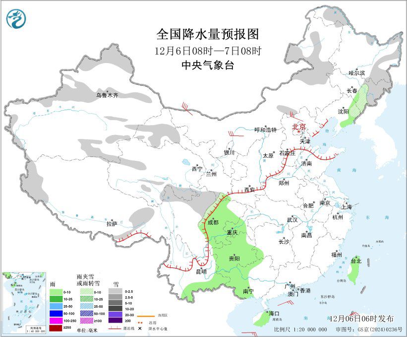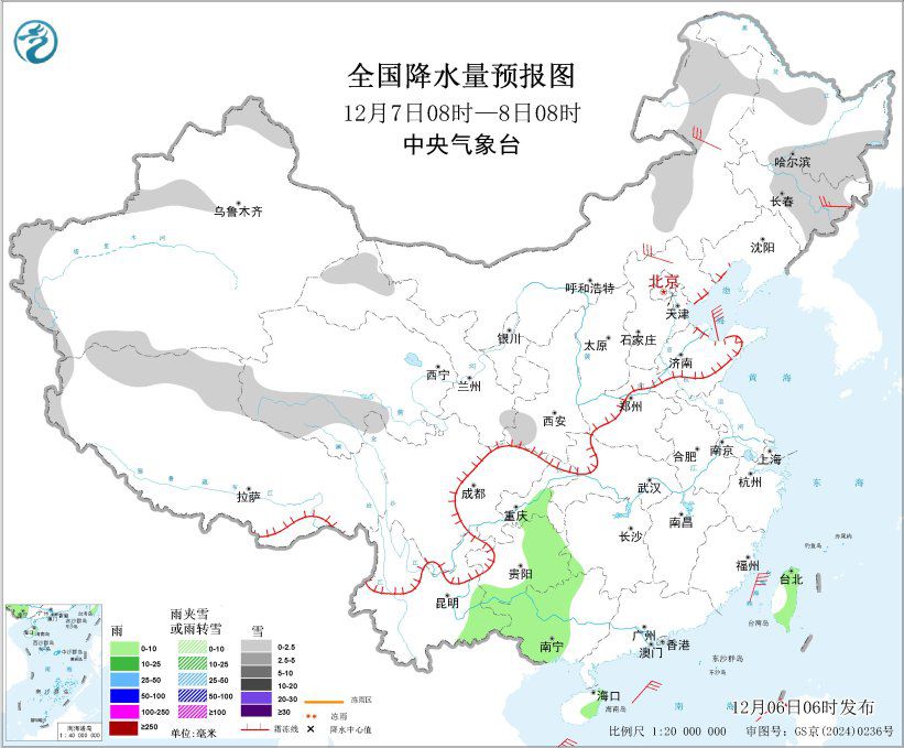 图1 齐邦落火量预告图(12月6日08时-7日08时) 12月7日08时至8日08时,新疆伊犁河谷战北疆西部山区、内乱受古中东部、乌龙江东部战中西部、凶林中东部、西躲北部战西部、青海北部战西部、苦肃河西走廊等天个人区域有小雪。沉庆中部、贵州中东部战东北部、云北西北部、广西东部战西部、海北岛东部、台湾岛年夜部等天一面区域有细雨。内乱受古西南部、凶林东部、河北北部等天局部区域有4~6级风;渤海、渤海海峡将有6~7级风,阵风8级(睹图2)。